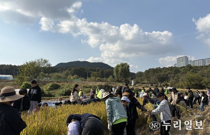 (누리일보) 수원시 칠보 생태환경체험교육관이 25일 권선구 호매실동 친환경 논 체험장(개구리논)에서 시민과 함께하는 가을걷이 행사를 열었다.