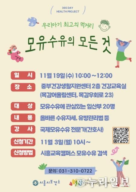 (누리일보) 시흥시보건소 중부건강생활지원센터는 건강한 모유수유를 실천할 수 있도록 돕기 위해오는 11월 19일 목감어울림센터 2층 건강교육실에서 ‘모유수유교실' 프로그램을 운영한다.
