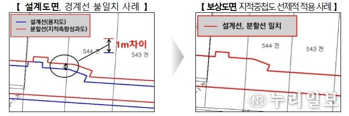 설계도면과 보상도면 간 경계선 차이의 선제적 해소를 위해 실시설계 단계에서 지적중첩도 작성과 선지정 지적현황측량을 실시한다.