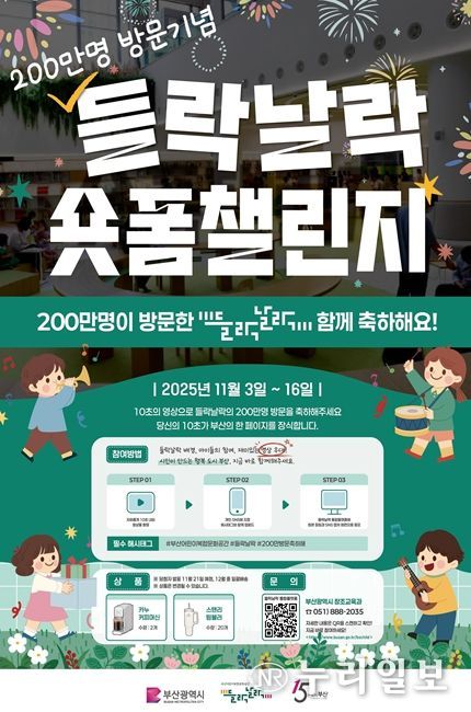 (누리일보) 부산시는 들락날락의 2025년 누적 방문자 200만 명 달성을 기념해 오늘(3일)부터 16일까지 2주간 시민과 함께하는 '들락날락 숏폼 챌린지'를 진행한다고 밝혔다.