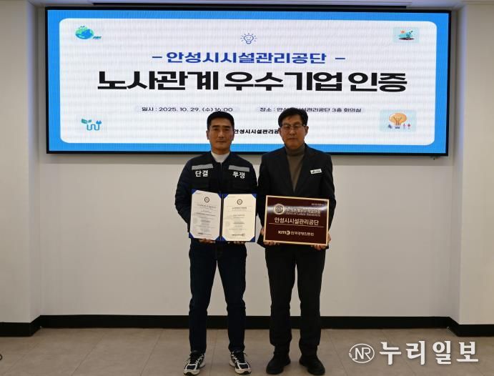 (누리일보) 안성시시설관리공단은 안성시시설관리공단 노동조합과 함께 상생과 신뢰를 기반으로 한 모범적인 노사문화를 인정받아 ‘노사관계 우수기업’ 인증을 획득하했다고 밝혔다.