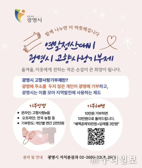 (누리일보) 광명시가 올해 12월 31일까지 ‘고향사랑기부금’을 집중적으로 모금한다.