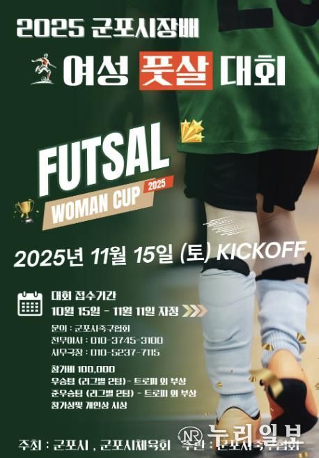 (누리일보) 군포시는 여성 생활체육 참여 확대와 건전한 스포츠 문화 확산을 위해 ‘2025 군포시장배 여성 풋살대회’를 오는 11월 15일(토) 군포시 국민체육센터 축구장에서 개최한다.