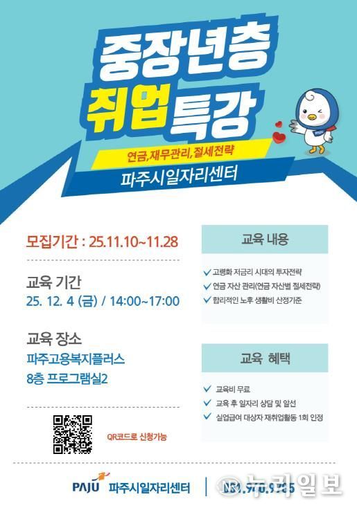 (누리일보) 파주시는 오는 11월 10일부터 28일까지 ‘중장년층 취업 특강’에 참여할 교육생 15명을 선착순으로 모집한다.