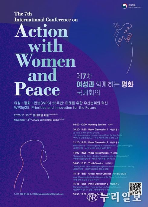 (누리일보) 외교부는 11월 13일 롯데호텔 서울에서 제7차 '여성과 함께하는 평화' 국제회의를 개최한다. 이번 국제회의는 유엔 여성ㆍ평화ㆍ안보(Women, Peace and Security, WPS) 의제 논의 25주년을 맞아 WPS 의제의 “미래를 위한 우선순위와 혁신”이라는 주제로 개최된다.