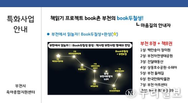 (누리일보) 부천시육아종합지원센터는 ‘책 읽는 도시 부천’에 발맞추어 2025년 영유아 독서 특화사업 ‘BOOK촌 부천의 BOOK두칠성!’으로 영유아의 발달적 특성과 요구에 맞춘 다양한 독서 프로그램을 운영하고 있다.