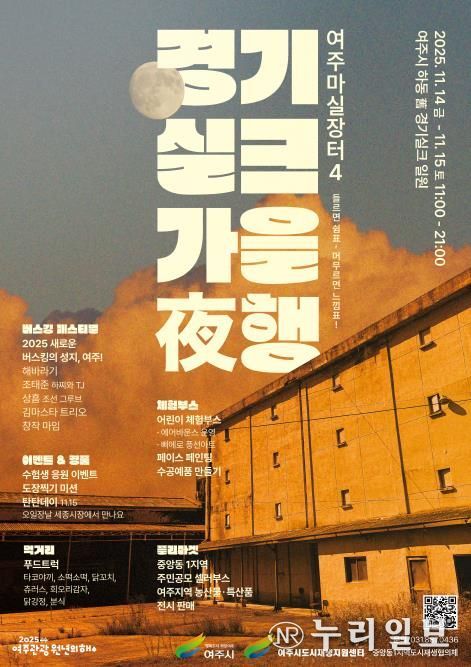 (누리일보) 여주시는 오는 11월 14일부터 15일까지 이틀간 여주 경기실크 일원(여주시 하동 123-6번지)에서 '여주마실장터4 가을야행'을 개최한다고 밝혔다. 이번 행사는 '2025 새로운 버스킹의 성지, 여주!'라는 슬로건 아래, 깊어가는 가을밤의 정취를 더할 버스킹 페스티벌과 함께 다채로운 마켓과 체험을 선보일 예정이다.