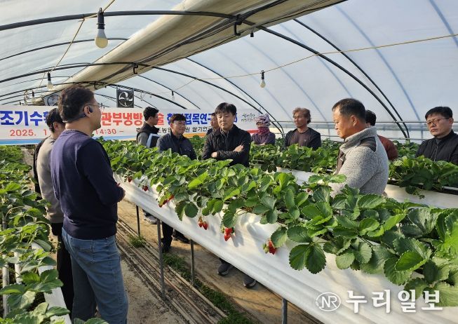 (누리일보) 충남도 농업기술원은 11일 논산시 현장접목연구 실증농가에서 딸기 농가의 소득증대를 위한 ‘딸기 조기정식 후 관부냉방 기술 현장평가회’를 개최했다.
