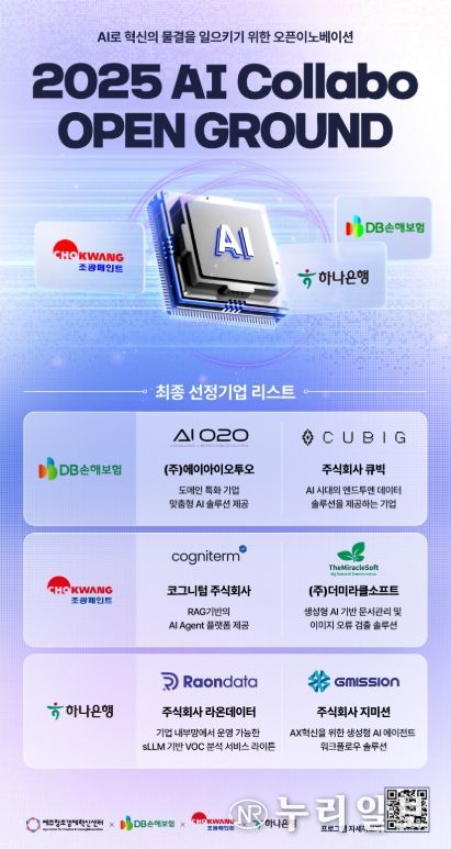 (누리일보) 제주창조경제혁신센터(대표이사 이병선, 이하 제주센터)는 DB손해보험, 조광페인트, 하나은행과 함께 추진하는 특화산업 오픈이노베이션 ‘2025 AI 콜라보 오픈그라운드 프로그램’을 통해 최종 6개 스타트업을 선정하고, 기술 테스트와 솔루션 개발을 통해 실질적인 사업화 협력에 나선다.
