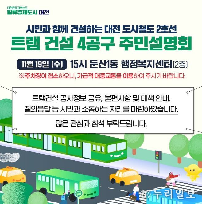 (누리일보) 대전시는 19일 오후 3시 둔산1동행정복지센터에서 도시철도 2호선 4공구(수정타운아파트~대전둔산경찰서) 건설공사와 관련한 주민설명회를 개최했다.