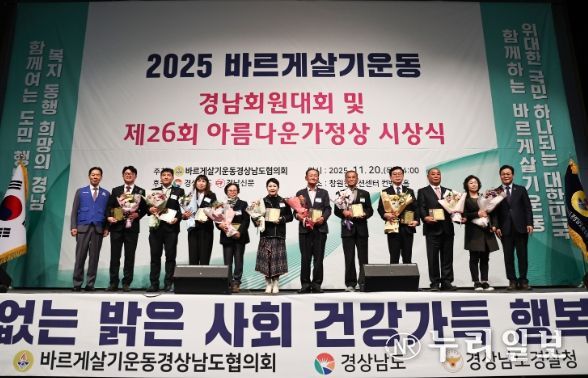 (누리일보) 경상남도가 20일 창원컨벤션센터에서 열린 ‘2025 바르게살기운동 경남 회원대회 및 제26회 아름다운 가정상 시상식’에서 지역사회 봉사에 앞장서 온 회원들을 격려했다.
