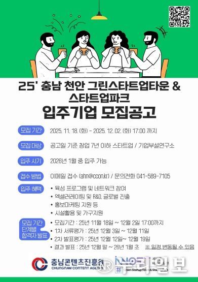 (누리일보) 충남콘텐츠진흥원은 오는 12월 2일까지 ‘충남 천안 복합형 스타트업 파크’에 입주할 신규 스타트업을 모집한다고 밝혔다.
