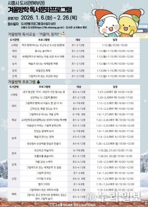 (누리일보) 시흥시는 겨울방학을 맞아 북부권 8개 공공도서관(소래빛ㆍ대야ㆍ목감ㆍ능곡ㆍ장곡ㆍ은계ㆍ신천ㆍ매화)에서 1월 6일부터 2월 26일까지 겨울독서교실 및 겨울방학 프로그램을 운영한다.