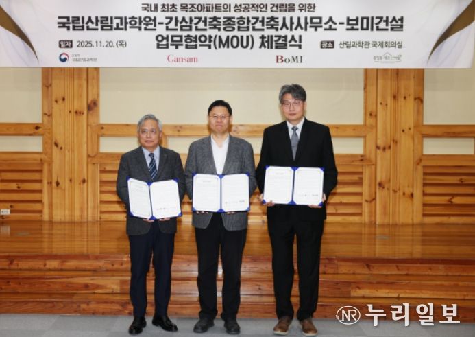 (누리일보) 산림청 국립산림과학원은 20일, 간삼건축종합건축사사무소, 보미건설과 함께 국내 최초 목조아파트 건립을 위한 업무협약을 체결했다고 밝혔다.