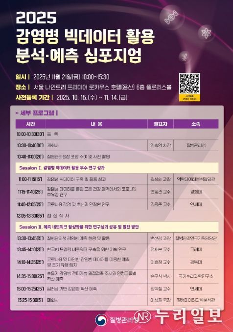 (누리일보) 질병관리청은 11월 21일 '2025 감염병 빅데이터 활용 분석·예측 심포지엄'을 개최하고, 연구성과를 공유하며 향후 데이터 기반 정책 고도화 방안을 논의한다.