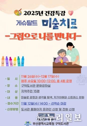 장말숙 구덕도서관장은 “이번 프로그램이 시민들이 그림을 통해 마음을 돌아보고 정서적 안정을 찾는 시간이 되길 바란다”며 “앞으로도 지역 주민의 삶의 질 향상을 위한 다양한 치유 프로그램을 운영하겠다”고 말했다.