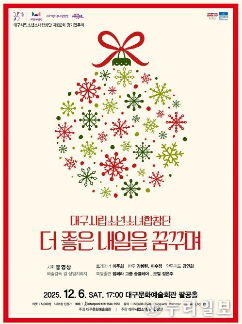 (누리일보) 대구시립소년소녀합창단(예술감독 겸 상임지휘자 홍영상)은 오는 12월 6일 오후 5시, 대구문화예술회관 팔공홀에서 제132회 정기연주회 ‘더 좋은 내일을 꿈꾸며’를 개최한다.