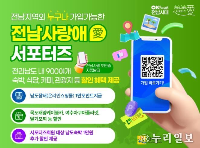 현재 전남 사랑애 서포터즈는 가입자가 62만 명을 넘어섰고, 관광·숙박·음식점 등 900여 할인가맹점 할인과 남도장터 쿠폰 제공, JN투어 숙박 할인 등 다양한 혜택을 제공하고 있다.