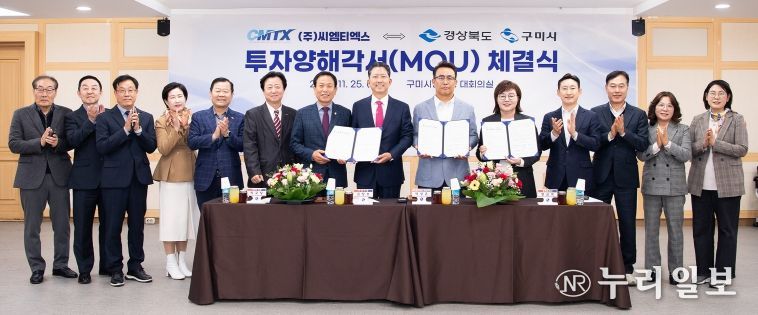 (누리일보) 경상북도와 구미시는 25일 구미시청 3층 대회의실에서 양금희 경상북도 경제부지사, 김장호 구미시장, 박교상 구미시의회 의장, 박성훈 ㈜씨엠티엑스 대표이사 등이 참석한 가운데 ㈜씨엠티엑스와 경상북도·구미시 간 투자양해각서(MOU)를 체결했다.