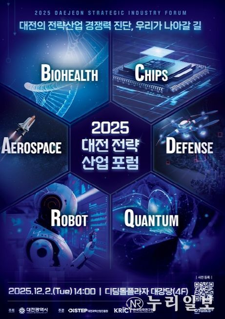 (누리일보) 대전시는 대전과학산업진흥원(DISTEP), 한국화학연구원(KRICT)과 함께 오는 12월 2일 오후 2시, 한국화학연구원 디딤돌플라자 4층 대강당에서 ‘2025년 대전 전략산업 통합포럼’을 개최한다.