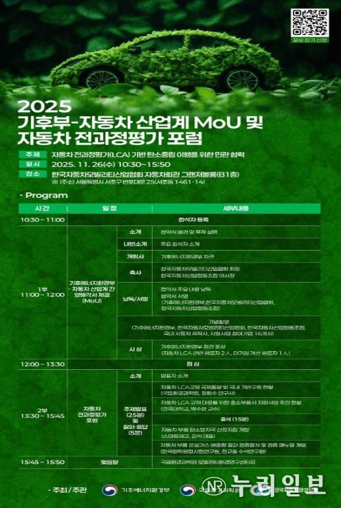 (누리일보) 기후에너지환경부는 11월 26일 자동차회관(서울시 서초구 소재)에서 국내 자동차 업계와 ‘자동차 온실가스 전과정평가(LCA) 역량 강화 및 탄소중립 협력을 위한 업무협약’을 체결한다고 밝혔다.