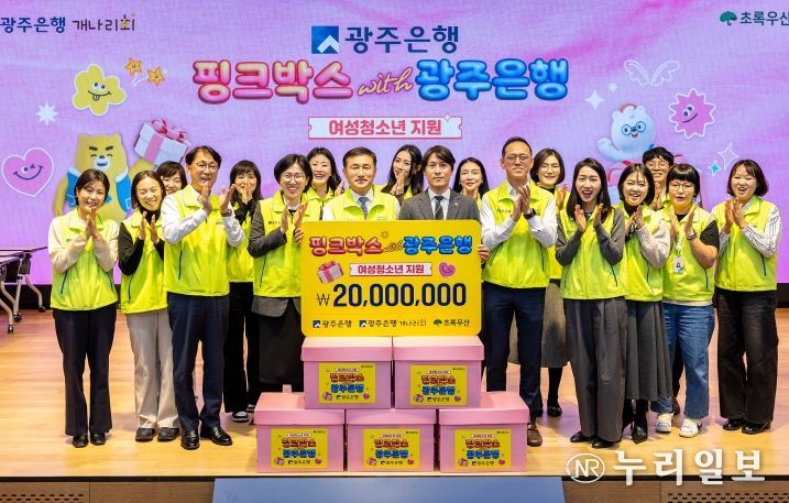 광주은행(은행장 고병일)은 지난 25일 본점에서 고병일 은행장, 변정근 초록우산어린이재단 광주지역본부장, 김경미 광주은행 여직원 모임 ‘개나리회’ 회장 등이 참석한 가운데, 지역 취약계층 여성 청소년 100명에게 제공할 ‘핑크박스’(총 2천만 원 상당)를 전달했다고 밝혔다.