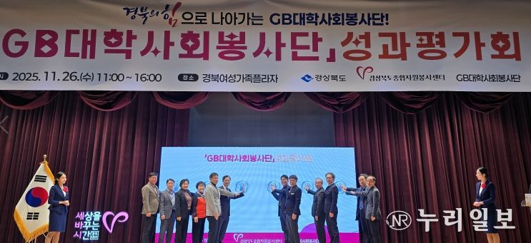 (누리일보) 경상북도는 26일 경북여성가족플라자에서 ‘2025 GB(경북)대학사회봉사단 성과평가회’를 개최하고, 2025년 한 해 동안의 지역사회 곳곳에서 자원봉사로 활약한 GB대학사회봉사단의 성과를 공유하는 시간을 가졌다.