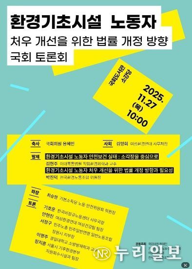 (누리일보) 기본소득당 국회의원 용혜인과 기본소득당 노동·안전위원회, 전국환경노동조합, 여성환경연대는 11월 27일 목요일 오전 10시, 국회도서관 소강당에서 '환경기초시설 노동자 처우 개선을 위한 법률 개정 방향 국회 토론회'를 공동 개최한다.