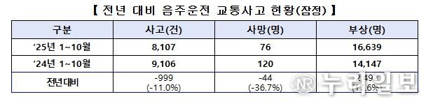 경찰청에서는 지속적인 음주운전 특별단속 및 집중 홍보, 음주 측정방해 행위(일명 술타기) 처벌 등의 영향으로 2025년 10월 31일 기준 음주 사고(-11.0%, 9,106건→8,107건) 및 사망자(-36.7%, 120명→76명)가 큰 폭으로 감소하고 있다.