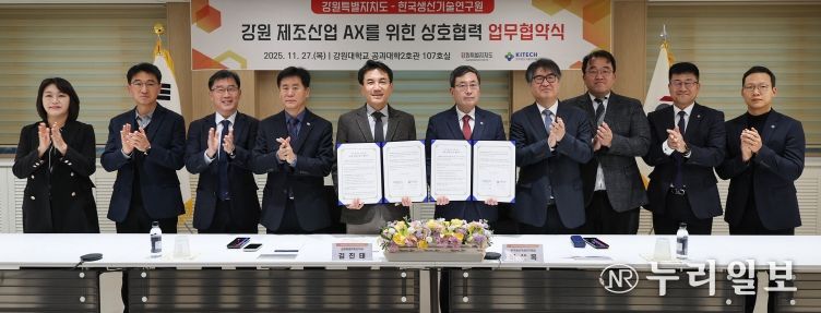 (누리일보) 강원특별자치도는 11월 27일 오후 3시, 강원 제조산업의 AX(AI Transformation, 인공지능 전환)를 위한 상호 협력을 강화하기 위해 한국생산기술연구원(원장 이상목)과 업무협약(MOU)을 체결했다.