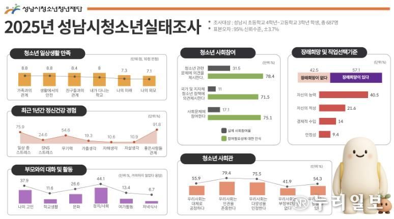 (누리일보) 성남시청소년청년재단은 관내 초등학교 4학년부터 고등학교 3학년까지의 총 687명을 대상으로 실시한‘2025년 성남시청소년실태조사’결과를 발표했다. 이번 조사는 성남시 청소년의 생활․정서․관계․사회참여 전반의 실태를 종합적으로 파악하기 위한 것으로, 표본오차는 ±3.7%이다.