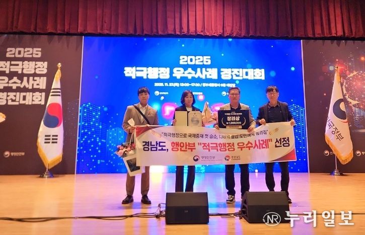 (누리일보) 경남도가 지난 27일 열린 행정안전부 ‘2025년 적극행정 우수사례 경진대회’에서 ‘적극행정으로 국제중재 첫 승소, 138억 절감 도민에게 돌려줘’ 사례로 기관 표창(인사혁신처장상)을 받았다고 28일 밝혔다.
