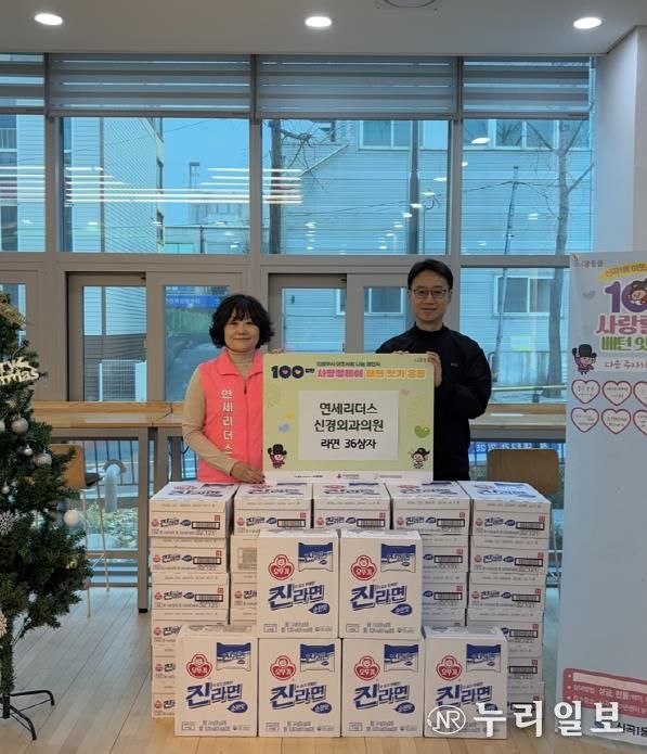(누리일보) 의정부시 신곡1동주민센터는 11월 27일 연세리더스신경외과의원이 저소득 취약계층을 돕기 위해 라면 36상자를 기탁하며 ‘100일간 사랑릴레이 배턴 잇기’에 동참했다고 밝혔다.