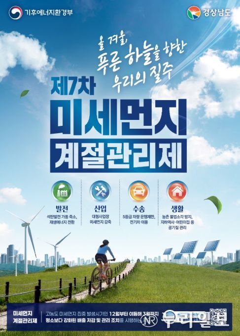 (누리일보) 경상남도는 올해 12월부터 내년 3월까지 ‘제7차 미세먼지 계절관리제’를 시행하며, 수송·산업·발전·생활 전반에서 미세먼지 배출 저감에 집중 대응 할 계획이라고 밝혔다.
