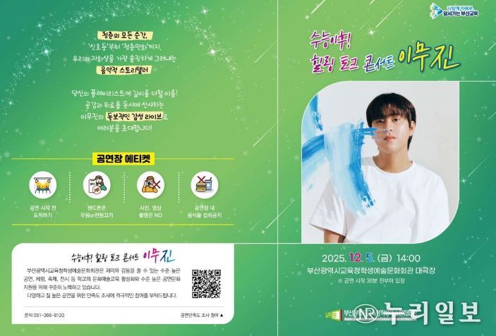 (누리일보) 부산광역시교육청학생예술문화회관(관장 박은혜)은 오는 5일 오후 2시 학생예술문화회관 대극장에서 수능을 마친 고3 학생 700여 명을 대상으로 가수 이무진과 함께하는 ‘수능 이후! 힐링 토크 콘서트’를 개최한다.