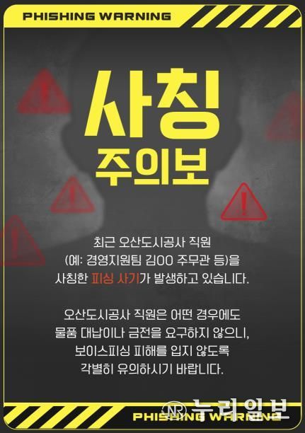 (누리일보) 오산도시공사는 최근 공사 직원을 사칭해 고액 물품 납품이나 계약을 요구하는 사례가 확인됨에 따라 지역 기업과 시민들에게 각별한 주의를 당부했다고 4일 밝혔다.