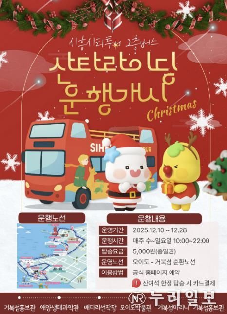 (누리일보) 시흥시는 연말을 맞아 오이도~거북섬을 순환하는 2층 버스에 크리스마스 테마를 적용한 특별 운행 ‘산타라이딩’을 12월 10일부터 운영한다. 이번 테마 운행은 겨울철 해양 관광 활성화와 연말 분위기 조성을 위해 조성을 위해 마련된 것으로, 12월 28일까지 운행되며 상황에 따라 기간은 연장될 수 있다.