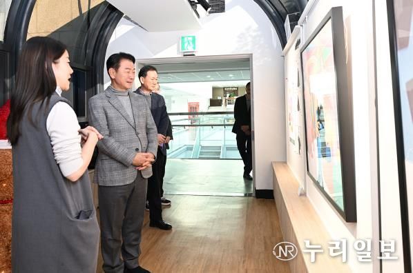 이날 김동근 시장은 본관 1층 로비에서 담은캘리그라피의 ‘영화 속 명대사(한글의 아름다움)’ 전시를 감상한 뒤, 연결통로로 이동해 ‘같이 걷는 발걸음’의 최소라 작가를 격려하고, 전시 공간 운영 방향에 대한 의견을 청취했다.