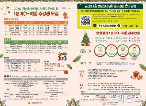 (누리일보) 수원시청소년청년재단 권선청소년청년센터는 오는 1월 6일부터 3월 27일까지 지역사회 평생학습 문화강좌 1분기(1~3월) 수강생을 모집한다.