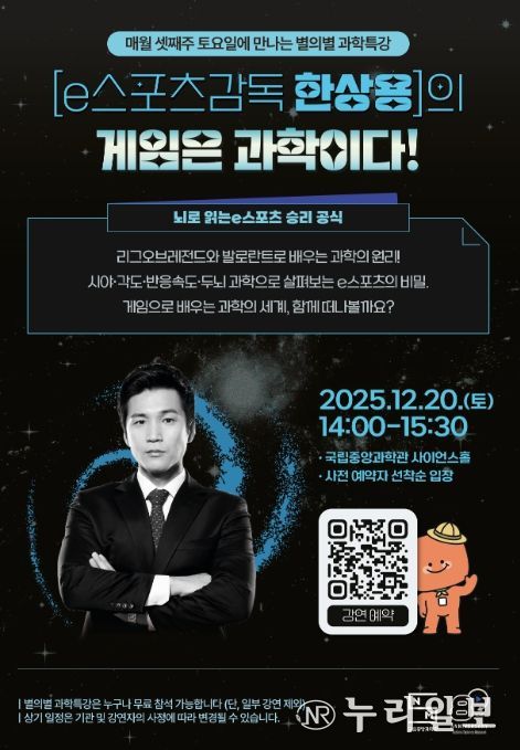 (누리일보) 과학기술정보통신부 국립중앙과학관은 12월 20일 오후 2시, 매월 셋째 주 토요일에 열리는 ‘별의별 과학특강’의 12월 강연자로 오산대학교 e스포츠학과 한상용 교수를 초청해 '게임은 과학이다'라는 주제의 강연을 개최한다고 밝혔다.