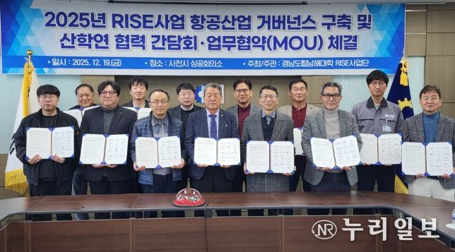 (누리일보) 경남도립남해대학(총장 노영식)은 19일 오전 10시 30분, 사천시 상공회의소 3층 회의실에서 지역 항공산업의 지속 가능한 성장과 경쟁력 강화를 위해 ‘2025 RISE·글로컬대학사업 성과 확산을 위한 항공산업 지·산·학 협력 거버넌스 구축 및 업무협약(MOU) 체결식’을 개최했다.