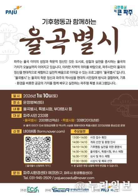 (누리일보) 파주시환경센터 ‘에코온’은 파주를 대표하는 조선시대 사상가 율곡 이이의 학문 정신을 현대적 기후행동 가치로 재해석한 기후문화축제 ‘기후행동과 함께하는 율곡별시’를 오는 내년 1월 10일 운정행복센터에서 개최한다.