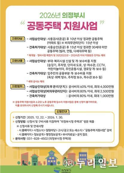 (누리일보) 의정부시는 노후 공동주택의 관리비용 부담 완화와 주거환경 개선을 위해 내년 1월 30일까지 ‘2026년 공동주택 지원사업’ 신청을 받는다.