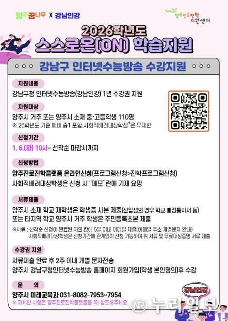 정유진 양주시 미래교육과장은 “청소년들이 진로와 진학을 준비하는 과정에서 학습 여건으로 인해 어려움을 겪지 않도록 지원하는 것이 중요하다”며 “강남인강 수강권 지원을 통해 학생들이 자신의 목표에 맞는 학습 계획을 세우고 꾸준히 실천할 수 있기를 바란다”고 말했다.