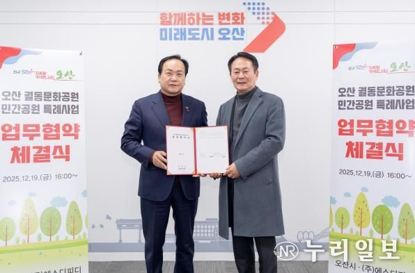 (누리일보) 오산시는 12월 19일 오산시청에서 궐동문화공원 민간공원조성 특례사업의 원활한 추진을 위해 사업 시행자인 ㈜에스디피디와 협약을 체결했다.