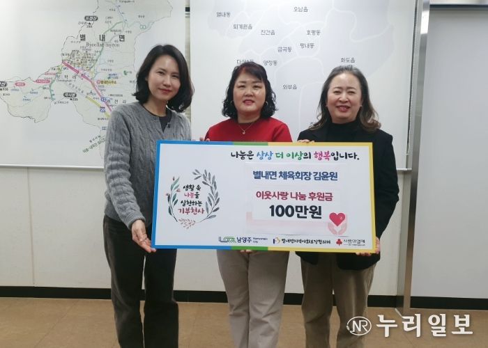(누리일보) 남양주시는 지난 19일 김윤원 별내면 체육회장이 지역 내 취약 가구 지원을 위해 이웃사랑 성금 100만 원을 별내면 지역사회보장협의체에 기탁했다고 22일 밝혔다.