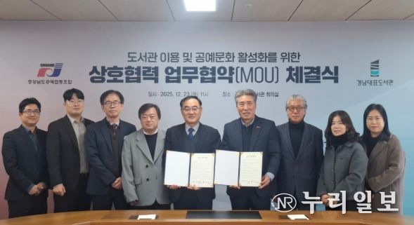 (누리일보) 경남대표도서관(관장 강순익)은 23일 오전 11시 경남대표도서관 회의실에서 경상남도공예협동조합(이사장 허일)과 도민의 공예문화 향유 기회 확대 및 도서관 이용 활성화를 위한 업무협약을 맺었다고 밝혔다.