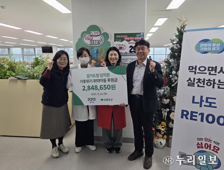 (누리일보) 경기도는 24일 경기도청에서 ‘도전! 잔반 제로!’ 캠페인으로 적립한 기부금 284만 8,650원을 초록우산어린이재단에 전달했다.