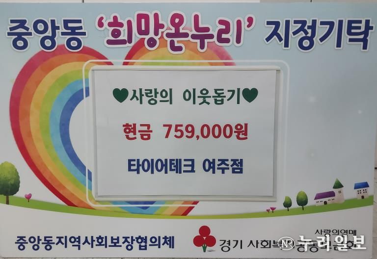 (누리일보) 타이어테크 여주점은 지난 23일 연말을 맞아 지역사회 취약계층을 돕기 위해 성금 75만9천원을 중앙동행정복지센터에 기탁했다.