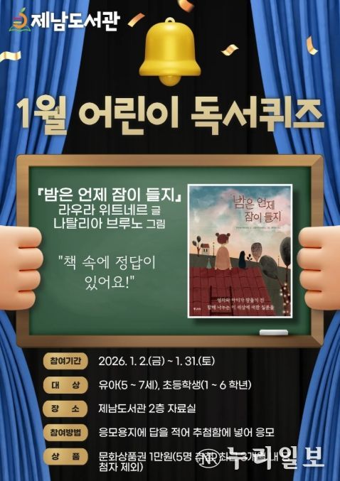 (누리일보) 제주도교육청 제남도서관은 내년 1월 2일부터 6월 30일까지 자료실에서 어린이를 대상으로 책도 읽고, 문제도 풀어보는 ‘어린이 독서퀴즈’를 운영한다.